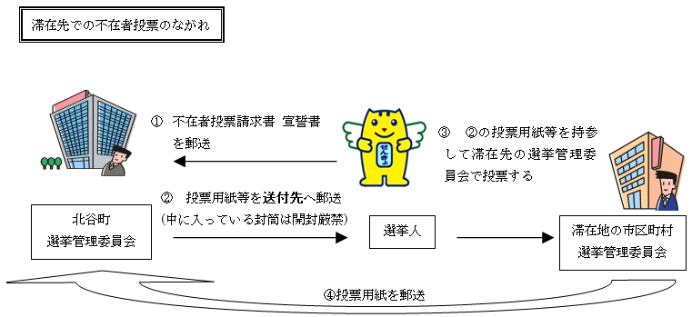 仕事や旅行などで北谷町外に滞在されている場合は、選挙管理委員会へ不在者投票請求書宣誓書を郵送して、滞在先に投票用紙を郵送してもらい、滞在先の選挙管理委員会で不在者投票をすることができます。