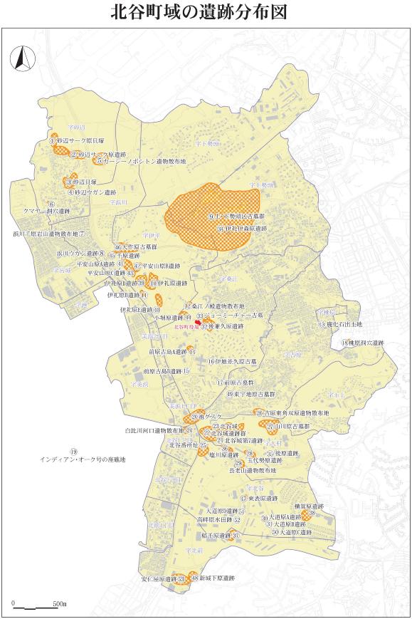 北谷町には、土に埋もれた数多くの埋蔵文化財が存在しています。現在確認されている埋蔵文化財は54ヵ所有り、そのほとんどは国道58号に近く、町の西側に分布しています。代表的な遺跡として、7,000年もの間、人々の生活がとぎれることなく続いた伊礼原遺跡(平成22年2月に国指定)や、県内で五指に入る規模を持つ北谷城、北谷の名を世界に知らしめた事で有名なインディアンオーク号にまつわる埋蔵文化財も確認されています。