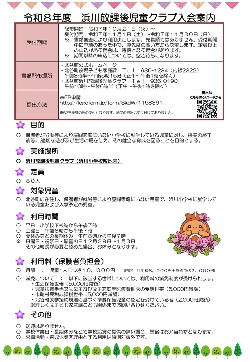 北谷町に在住し、保護者が就労等により昼間家庭にいない児童で、浜川小学校に就学している児童および浜川小学校に入学予定の児童。