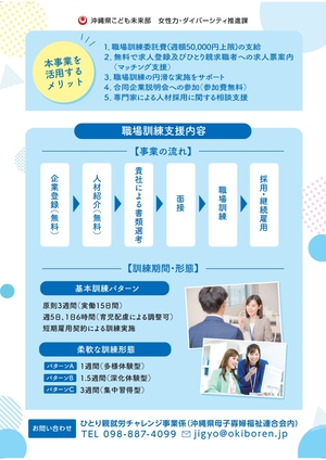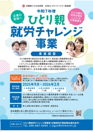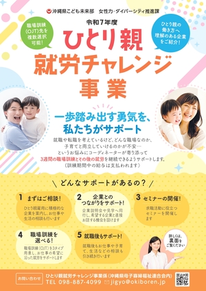 沖縄県は、ひとり親の就労に対する不安軽減及び就労へのイメージを深めるとともに、ミスマッチ等による就労後の離職の軽減を図るため、令和7年度から新たに「ひとり親就労チャレンジ事業」を開始しております。