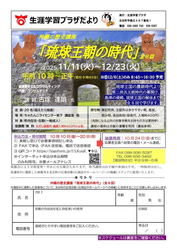 令和7年度は学ぶ機会が少ない琉球王朝時代の農工時代から始まり、第二尚氏王統時代の幕開け、島津の侵略、琉球王国の解体までを全8回で学びます。座喜味城跡、勝連城跡の屋外学習も行います。