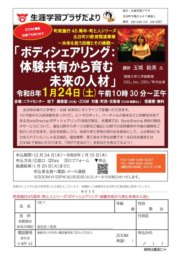 町制施行45周年・町と人シリーズの第3回目。町出身の工学博士で教授の玉城 絵美氏が歩んだボディシェアリング体験をキーワードにオンラインで講和をいただく。人間の20ある間隔の中の「固有感覚」をデジタル化し開発されたデバイスを使うことで能動的な体験共有を可能にする技術、そのデバイスを活用し何をしていくか、を開発者・起業家として沖縄の未来や人材育成などの話もオンライン講演で話を伺います。