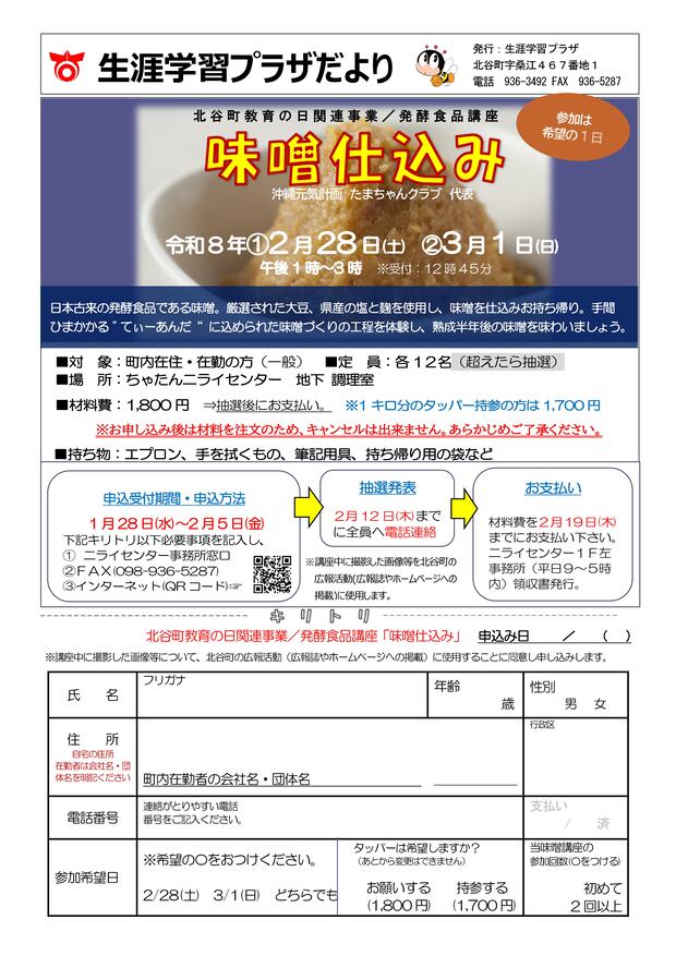 北谷町教育の日関連講座/発酵食品講座「味噌仕込み」