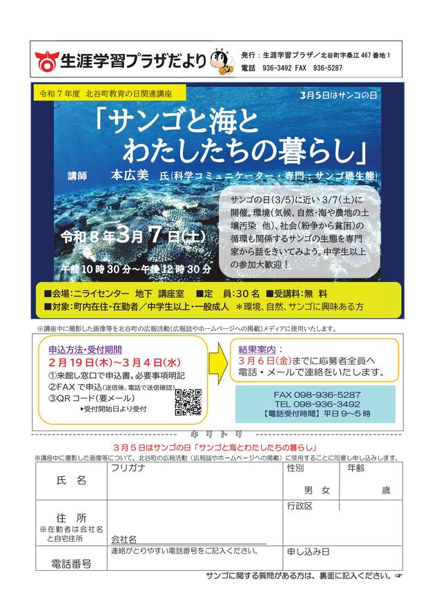 北谷町教育の日関連講座3月5日はサンゴの日「サンゴと海とわたしたちの暮らし」