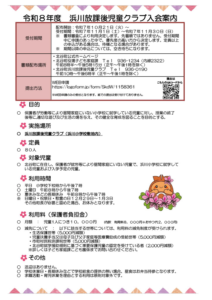 北谷町に在住し、保護者が就労等により昼間家庭にいない児童で、浜川小学校に就学している児童および浜川小学校に入学予定の児童。