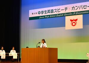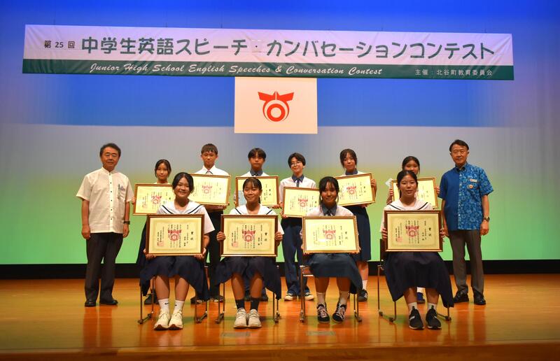 去る8月28日木曜日、ちゃたんニライセンターカナイホールにおいて、第25回北谷町中学生英語スピーチ・カンバセーションコンテストが開催されました。町立中学校2校から計10名が出場し、中学生らしいテーマで堂々と英語によるスピーチを行った後、「私の好きな沖縄の伝統文化」という題で、生徒同士で約30分間質疑応答を行いました。スピーチ部門、カンバセーション部門の内容を総合的に判断し、下記のとおり入賞者が決定しました。